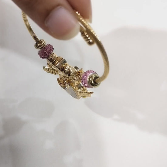 Crafted with premium materials, its anti-tarnish and long-lasting finish ensures it stays as radiant as the day you got it. The golden cable band is lightweight yet durable, making it perfect for everyday wear. Featuring sparkling pink crystal beads, celestial charms, and a delicate crown motif, this piece is more than just jewelry—it’s a statement of grace and individuality.